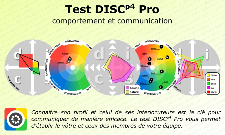 Le test DISCp4 Pro vous permet d'établir votre profil de manière approfondie. Il prend d'autant plus de valeur lorsqu'il est partagé avec les membres de son équipe1. N'hésitez donc pas à les inviter à découvrir, à leurs tours, leurs profils.